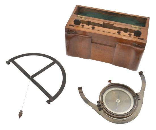 A FRENCH CASED BRASS AND STEEL MINER'S COMPASS, PROTRACTOR AND PLUMB LINE