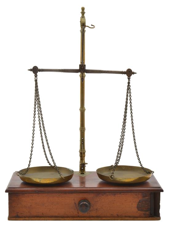 A SET OF BRASS AND STEEL BEAM SCALES ON A MAHOGANY BASE