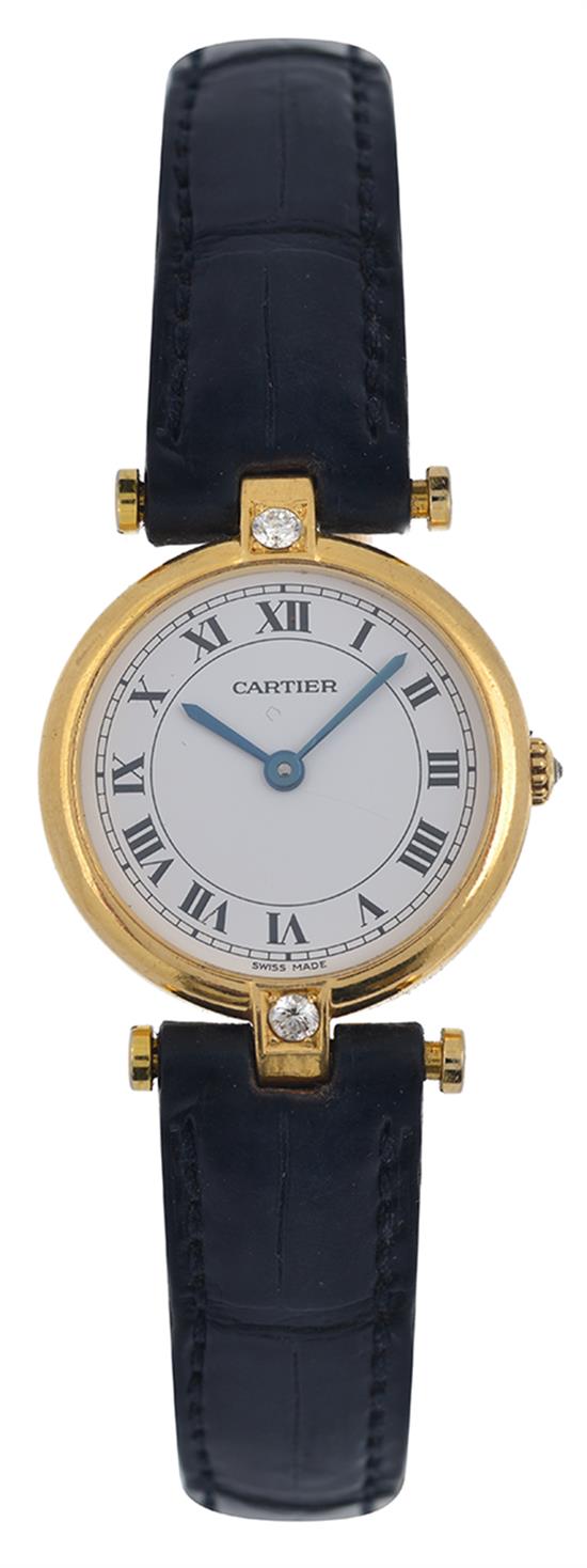 Quartz movement, cream circular dial with black Roman numerals, signed case, dial and movement, 18ct gold case with diamond set lugs and black leather bands with deployment clasp, serial number 810760141, 22mm diameter.