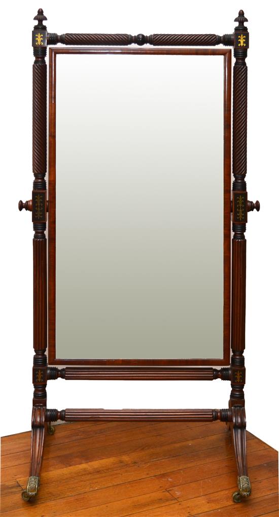 A 19TH CENTURY BRASS INLAID MAHOGANY CHEVAL MIRROR