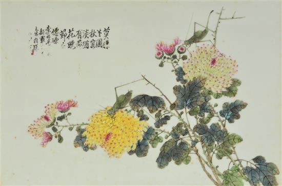the tile depicting the traditional motif of chrysanthemums with grasshoppers, in bursts of yellow, pink, green and white enamels, with an inscription, signed