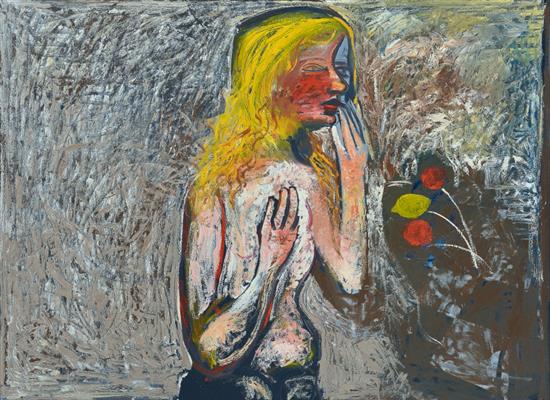 However, It is also a reflection on Blackman's European experiences. In 1970 he was granted the Moya Dyring studio at the Cité Internationale des Arts in Paris. An exhibition on Matisse impressed Blackman, as did the stained glass art in the Gothic cathedrals of Paris. This is particularly clear in the current work in both content and form. While Old Testament themes are rare in the artist's paintings, his exposure to the whole gamut of European art led him to experiment with the religious narratives. Eve is here shown with hand to mouth, contemplating whether or not to eat the forbidden fruit – here shown as a citron (a rarely depicted iconographical alternative to the apple and fig). The bold black outlines of Eve's visage mimics both Matissian stencilling and stained glass delineation, and the primary colour triumvirate of the head is doubled in the fruit and flower arrangement. The theme of Eve also allowed the artist to return to the study of the nude – something Blackman had abandoned since the 1940s and returned back to only in1971. This large work also points to Blackman's sympathy toward Abstract Expressionism. Although strongly opposed to non-objective art – which was all the rage following the National Gallery of Victoria's 1968 The Field exhibition – Blackman often introduced expressive manners to fill in otherwise plain fields. The figure, and her surrounding, is built up as a mesh of overlapping dabs, scribbles and marks – fruit of a rapid and energetic brushwork, reminiscent of the growing New York school of figurative Abstract Expressionists. Golden Eve is an excellent example of Blackman's ability to absorb and adapt new styles and themes throughout his long career.