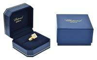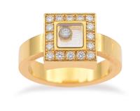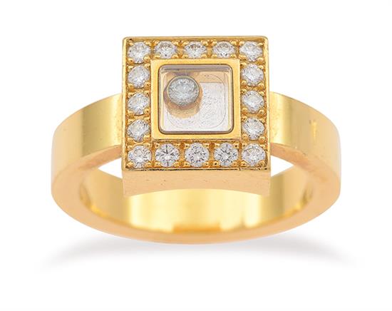The floating diamond mounted in a square diamond set frame, set in 18ct gold, ring size L, boxed.