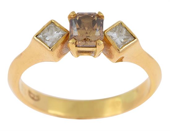 Centrally set with an emerald cut champagne diamond of 0.60cts, flanked by two princess cut diamonds totalling 0.30cts, mounted in 18ct gold, ring size M.
