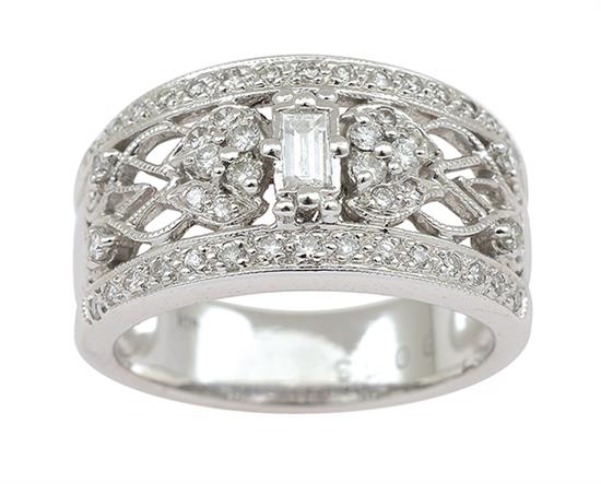 The pierced panel set throughout with baguette and round brilliant cut diamonds totalling 0.53cts, mounted in 18ct white gold, ring size M.