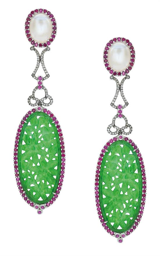 A PAIR OF JADEITE, RUBY AND MOONSTONE EARRINGS