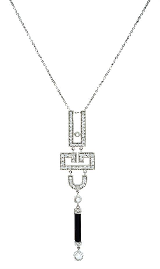 Of geometric design, set throughout with round brilliant and rose cut diamonds and having an onyx panel, suspended on a trace chain, mounted in 18ct white gold, total length 450mm.