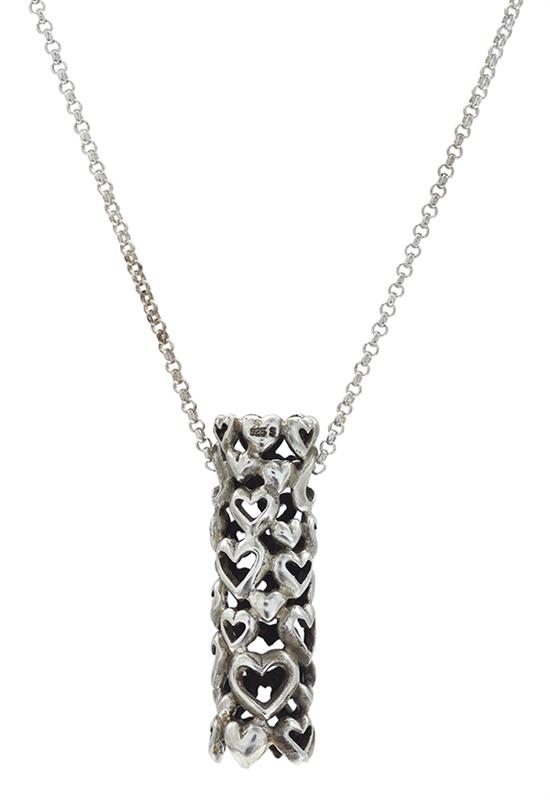 Of cylindrical pierced design, styled in sterling silver, signed ASCH, reference 252, suspended on a sterling silver trace chain.