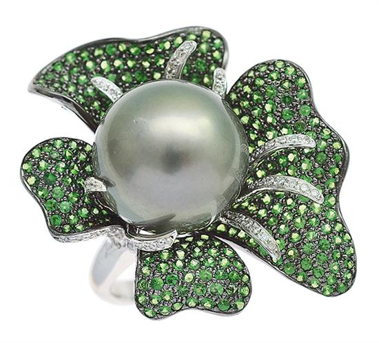 A TAHITIAN PEARL, TSAVORITE GARNET AND DIAMOND RING