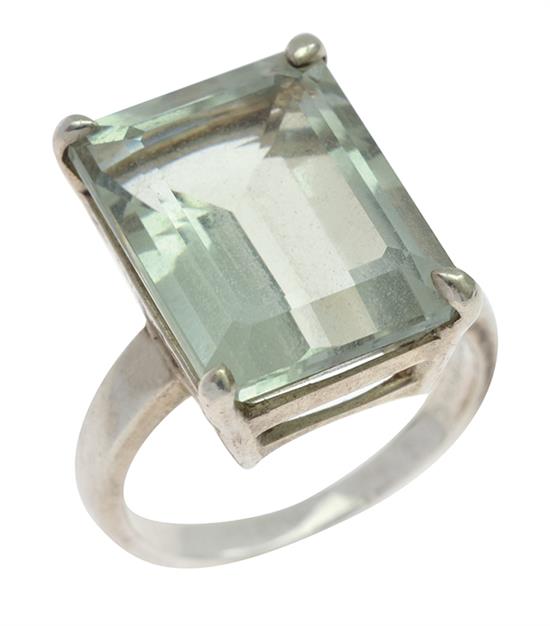 The emerald cut green quartz of 10.10cts, mounted in sterling silver, signed, ring size L.