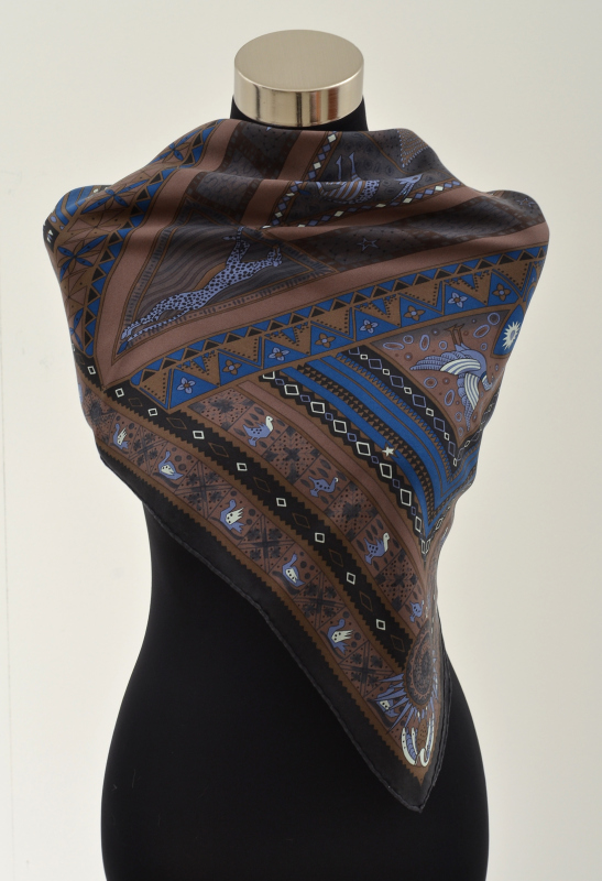 The 'Ors Bleus d'Afrique' design by Zoe Pawells, styled in tones of blue and brown, 90cm square.
