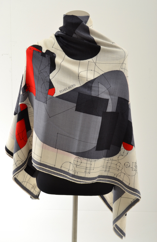 The 'Echec au Roi' design styled in tones of grey and red on a cream background,134cm square.