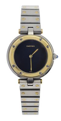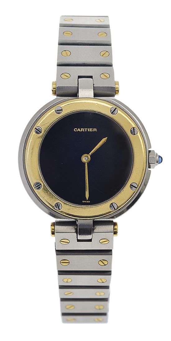 Quartz movement, black circular dial, signed case, dial and movement, stainless steel and gold case and conforming bracelet bands, serial number 8191305376, 25mm diameter.