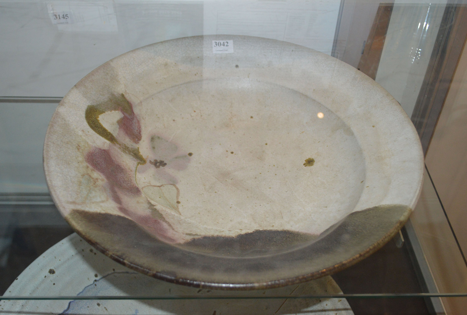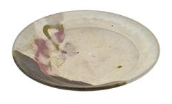 cream ground with subtle flower and leaf motif and olive glazed accent to side, 37cm diameter, incised 'Milton Moon' to base