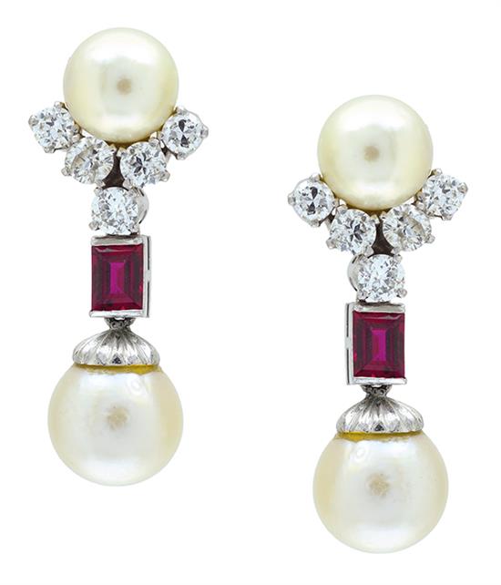 A PAIR OF CULTURED PEARL, RUBY AND DIAMOND EARRINGS