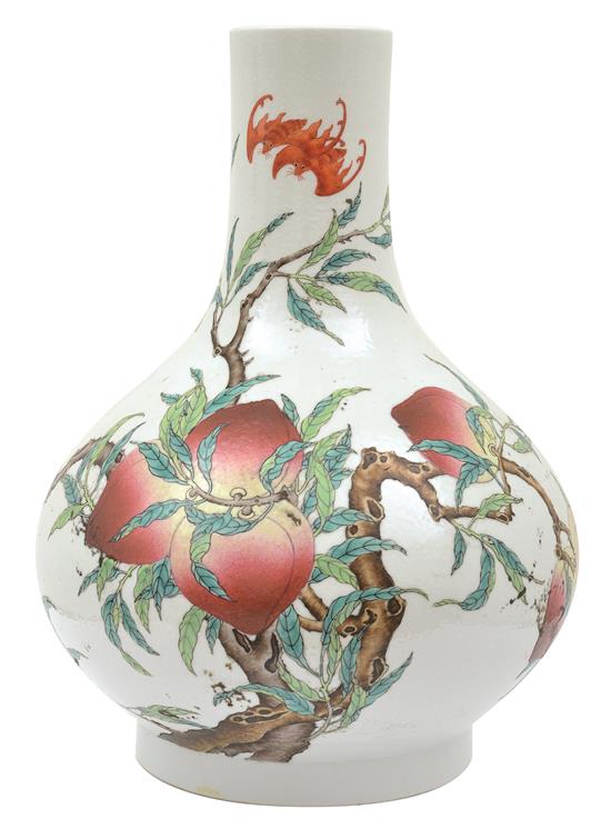 enamelled with nine red and yellow peaches, a pair of bats painted in iron stone red and a six character iron red Guangxu mark to base, 32 cm high