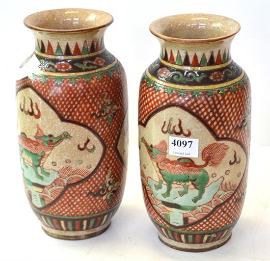 a pair of enamel and iron stone red, painted vases with winged mythical figures within stylised panels, six character to base mark, 20 cm high
