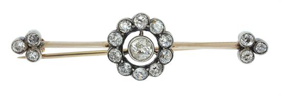 Featuring a pierced flower cluster set with old European cut diamonds, terminating with a trefoil of diamonds to each end of the knife edge bar, mounted in rose gold and silver.