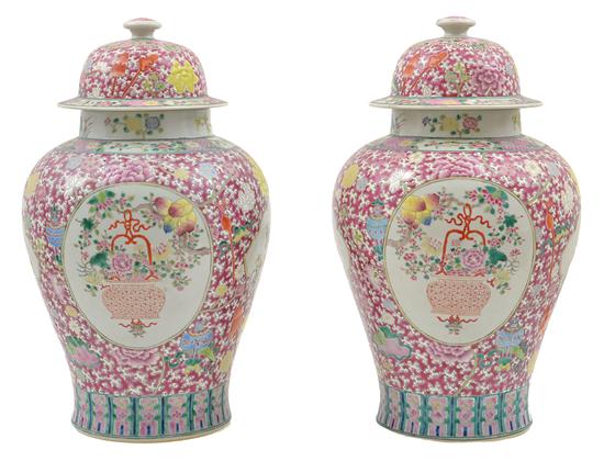 A PAIR OF FAMILLE ROSE LIDDED VASES