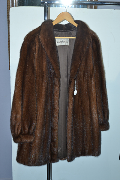 The brown jacket with shawl collar, labelled Erich Planinsek, centre back length 83cm.