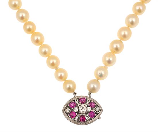The round pearls of creamy hue measuring 8.4mm - 9.4mm, to a marquise shaped clasp set with round old brilliant cut diamonds and mixed cut synthetic rubies, mounted in white gold, total length 400mm.