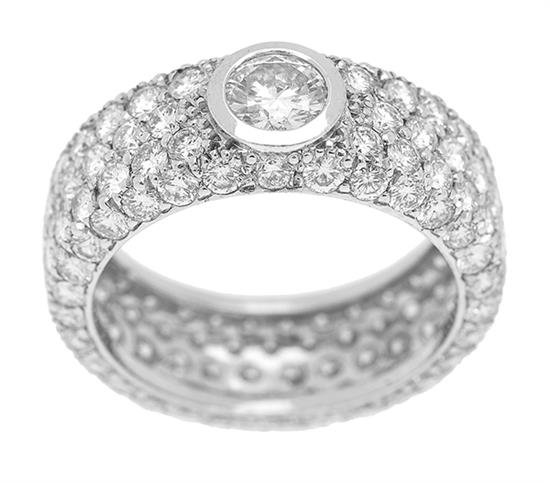 Centrally set with a round brilliant cut diamond of 0.50cts, surrounded in a full circle band of pave set diamonds, mounted in 18ct white gold, ring size O.
