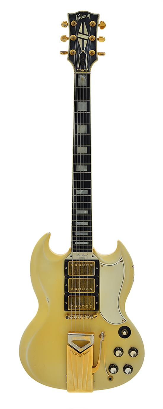 Featuring Maestro sideways tremolo, 3 x PAF pickups and 100% original parts incl. original frets. Guitar has been oversprayed white and has had fixed bridge installed and reverted at some point. Original case.