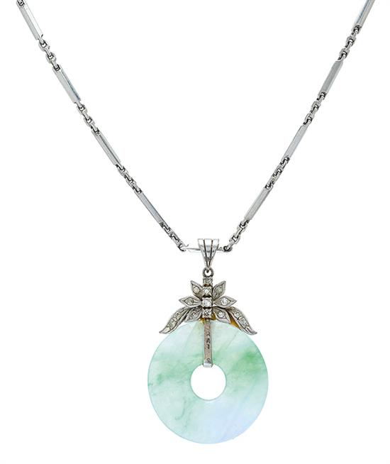 The circular pierced pie jade plaque of lavender and green hues having a diamond set bale, suspended from a platinum fancy link chain, total length 500mm.