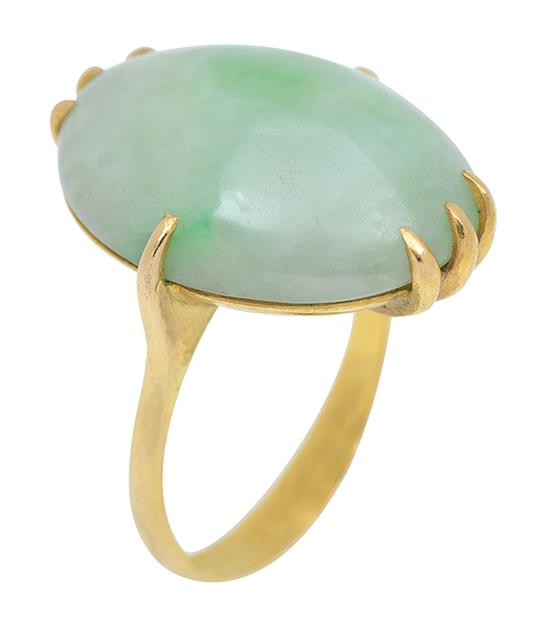 The oval jade cut en cabochon, mounted in 22ct gold, ring size Q-R.