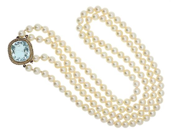 A DOUBLE STRAND OF CULTURED PEARLS WITH AQUAMARINE CLASP