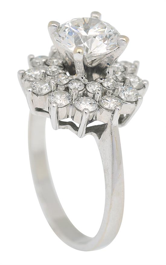 Centrally set with a round brilliant cut diamond of 1.75cts, with GIA lazer inscription, colour E, clarity VS1, surrounded by a double row of further diamonds totalling 1.00cts, mounted in 18ct white gold, ring size N.