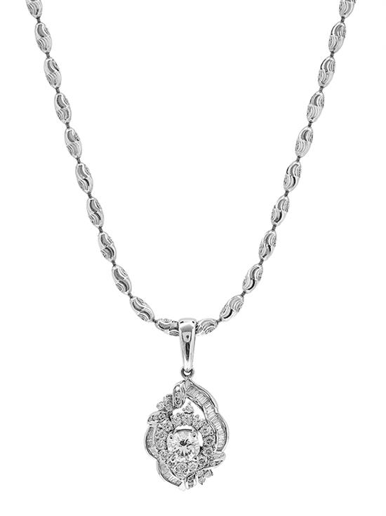 Centrally set with a round brilliant cut diamond of 0.80cts, with GIA laser inscription, colour E, clarity VS1, surrounded by round and baguette cut diamonds, suspended from a fancy link chain, all set in 18ct white gold, total length 510mm.