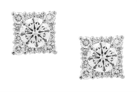 Each centrally set with a round brilliant cut diamond of 0.80cts, with GIA laser inscription, colour E, clarity VS1, surrounded by further diamonds, mounted in 18ct white gold.