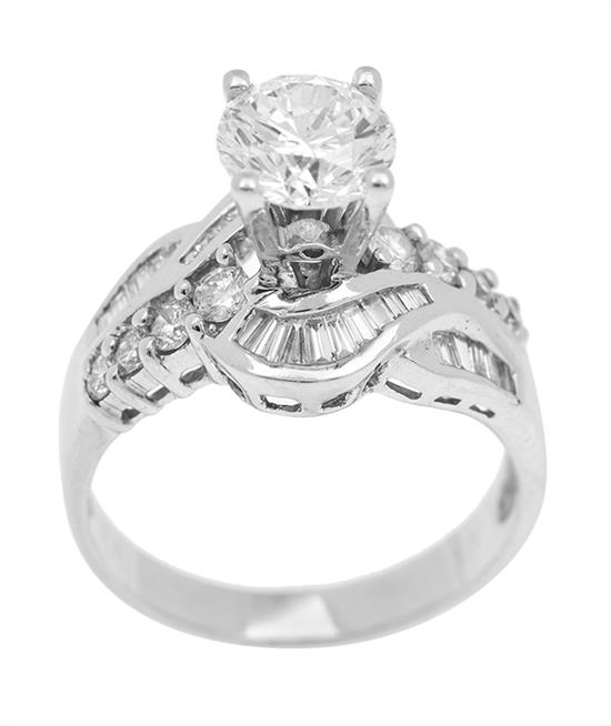 The round brilliant cut diamond of 1.22cts, with GIA laser inscription, colour H, clarity VVS2, having further round and baguette cut diamonds set below totalling 0.64cts, mounted in 18ct white gold, ring size N.