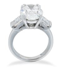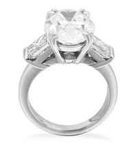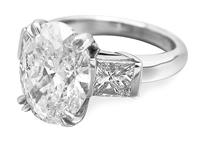 The oval cut diamond of 5.01cts, flanked by two princess cut diamonds totalling 1.40cts, mounted in 18ct white gold, ring size H-I, principal diamond accompanied by a GIA certificate stating colour G and clarity SI1.