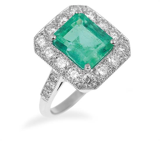 The emerald cut emerald of 2.63cts, surrounded by round brilliant cut diamonds totalling 1.10cts, mounted in 18ct white gold, ring size L.