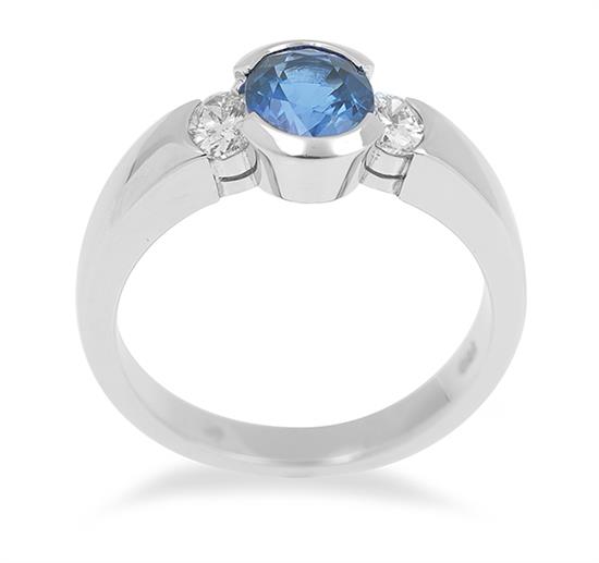 The oval cut sapphire of 1.61cts, flanked by two oval cut diamonds totalling 0.30cts, mounted in 18ct white gold, ring size O.