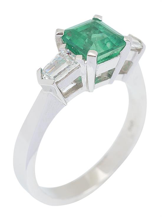 The square cut emerald of 1.55cts, flanked by two bullet cut diamonds totalling 0.50cts, mounted in 18ct white gold, ring size N.