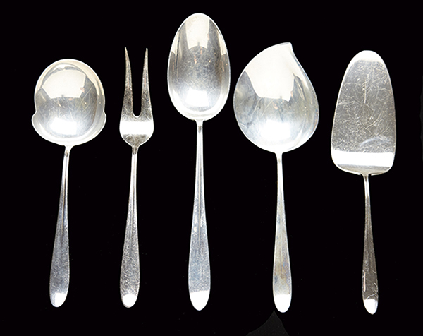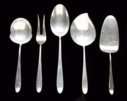 Comprising a full setting for twelve and accoutrements; 1 x serving spoon, 1 x large spoon, 1 x meat fork, 1 x dessert slice and 1 x dessert serving spoon, 2 x butter knives, 1 x sauce ladle and 1 x condiment ladle, total of 177 pieces. Total weight 7,709 grams.