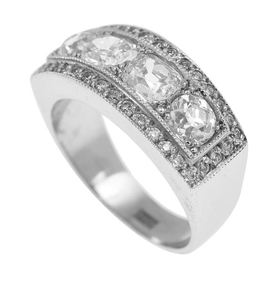 Centrally set with four old style vintage cut diamonds totalling 1.62cts, surrounded by further diamonds, mounted in 18ct white gold, ring size L.