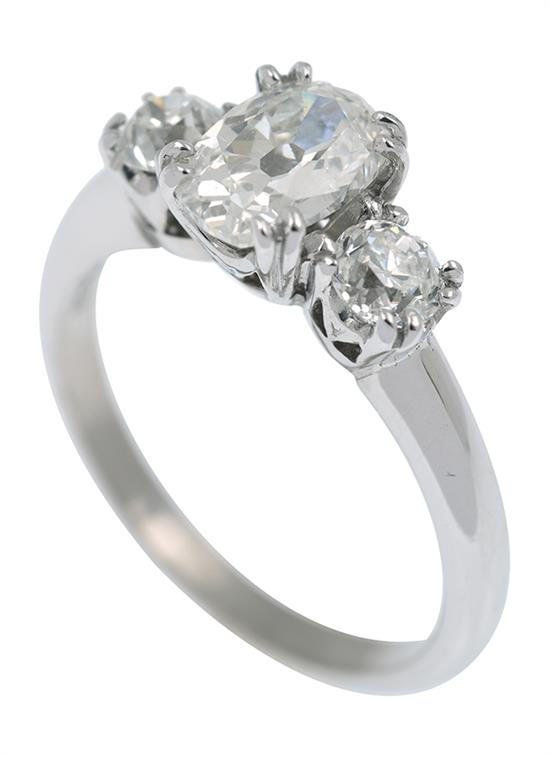 Centrally set with an oval old style vintage cut diamond of 1.04cts, flanked by two further diamonds totalling 0.48cts, mounted in 18ct white gold, ring size K.