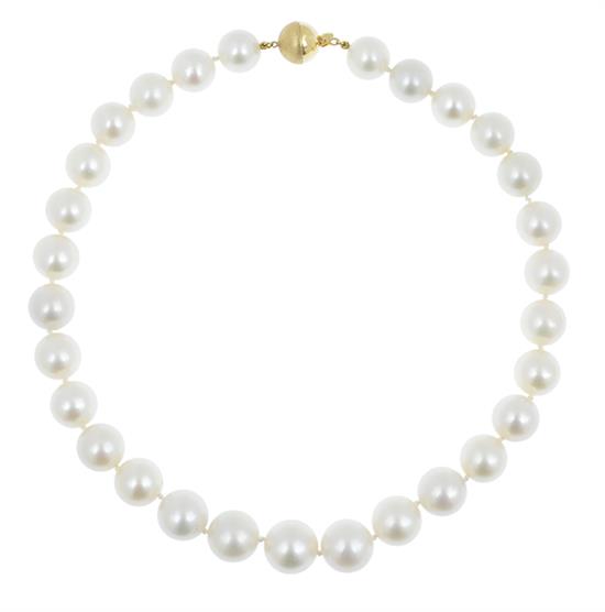The graduated round pearls of creamy pink hues measuring 12.30mm - 14.90mm, to an 18ct gold ball clasp, total length 430mm.