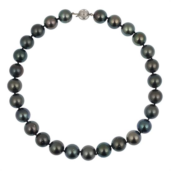 The graduated round pearls of greeny grey hues measuring 14.00mm - 14.90mm, to an 18ct white gold and diamond ball clasp, total length 430mm.