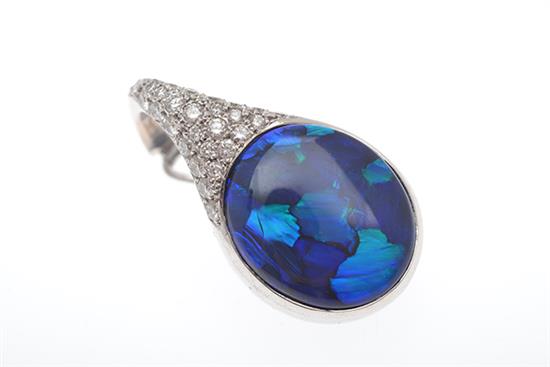 The oval solid black opal cut en cabochon of 15.00cts, having a pave set diamond bale, mounted in 18ct white gold.
