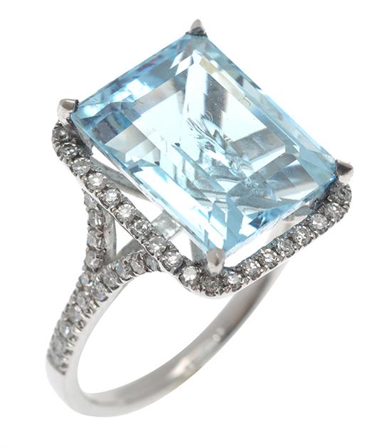 The emerald cut aquamarine of 7.75cts, surrounded by round brilliant cut diamonds totalling 0.40cts, mounted in platinum, ring size N.