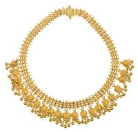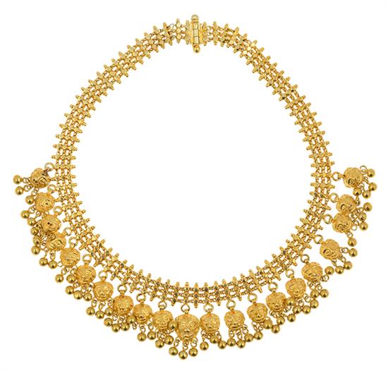 The triple fancy link collar set with twenty one carved monkey face charms, in 14ct gold, total length 400mm.