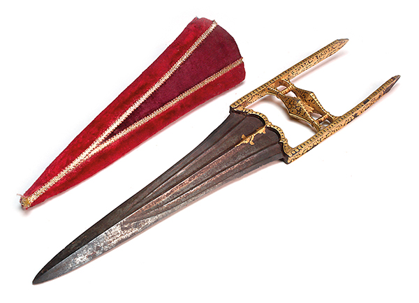 steel blade with three blood grooves, gold damascened hilt with floral decoration, housed in velvet sheath, 40.5cm long