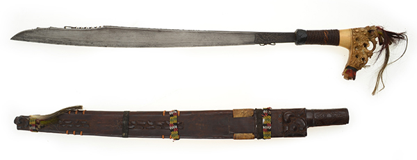 raised carving and fibre lashing on wooden sheath, carved deer horn grip, finely incised floral motif one side, inlaid brass dots the other, 61cm total length