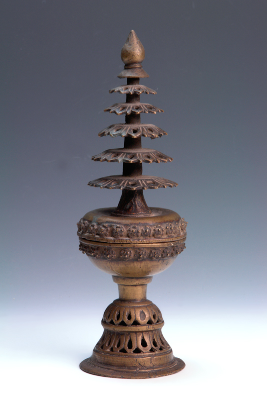 A BURMESE BRONZE OINTMENT VESSEL, pagoda form, with twist mechanism, 25cm high