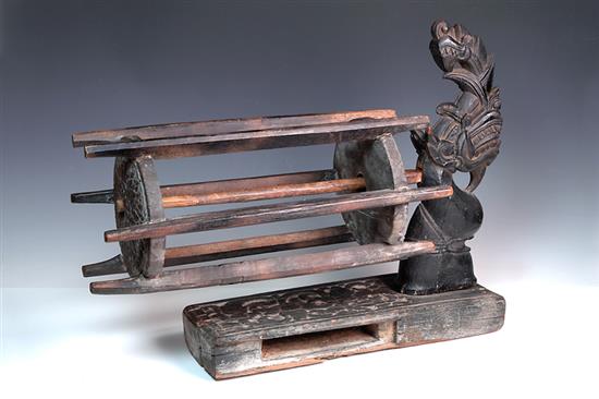A 19TH CENTURY THAI SPINNING REEL, wood carved with dragon stand, 45.7cm high
